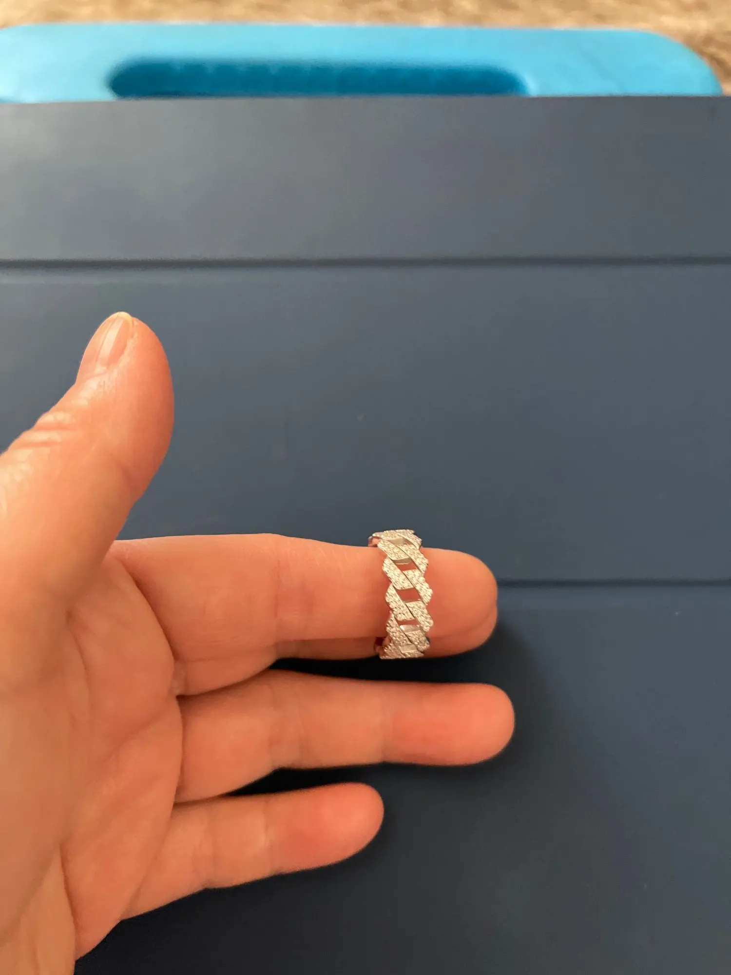 Crafted from premium 925 sterling silver, this Moissanite Cuban ring offers a bold yet refined style suitable for all genders. Featuring an eternity band design adorned with sparkling moissanite stones, it reflects a perfect blend of hip hop aesthetics and timeless elegance. Durable and comfortable, this ring is an expert choice for those seeking distinctive luxury with enduring quality.